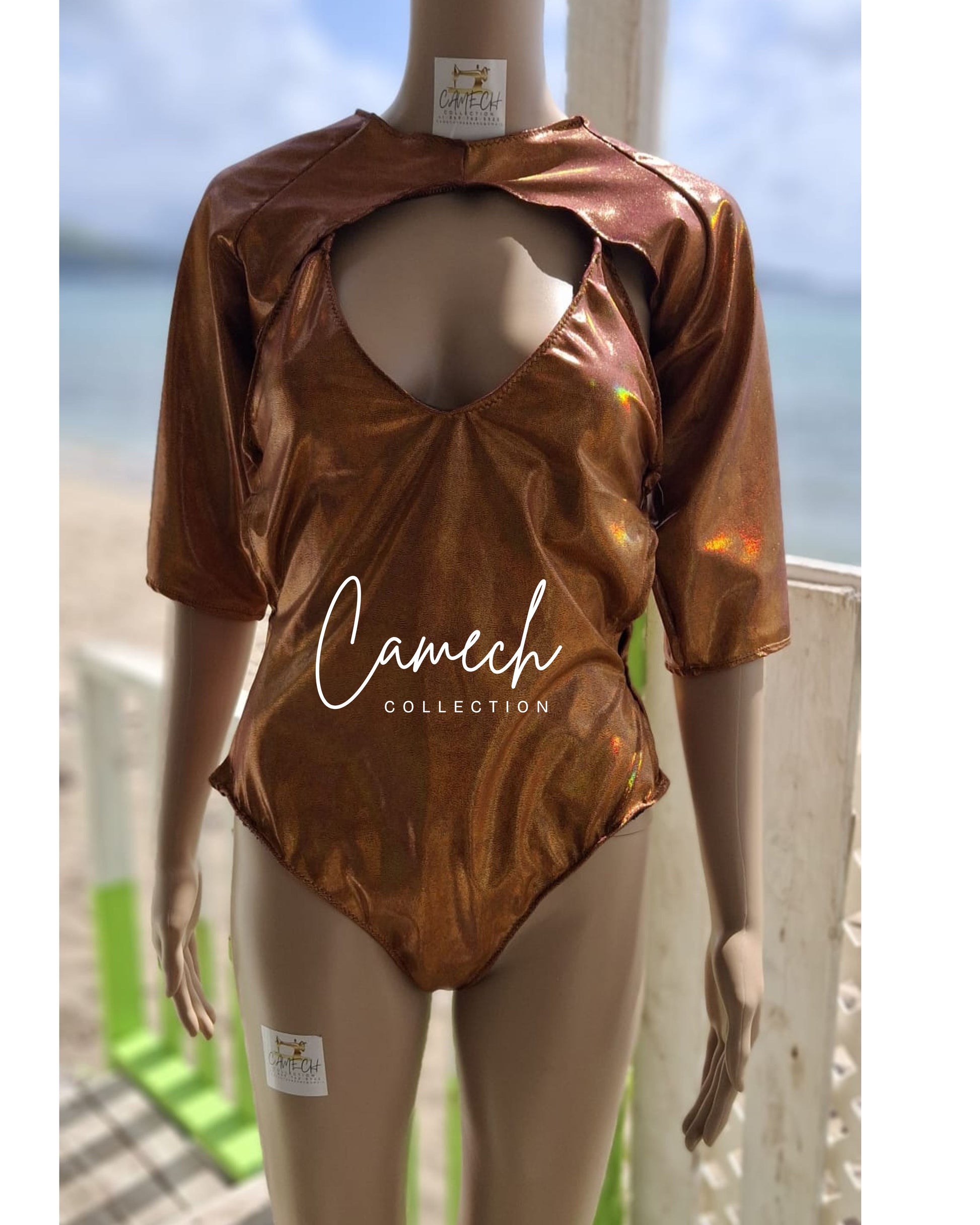 Fete with confidence in our Shimmery Copper Fete-Wear, designed to make you the center of attention. Crafted from luxurious, metallic copper fabric, this stunning piece features elegant sleeves and a body-flattering fit that moves effortlessly with you.