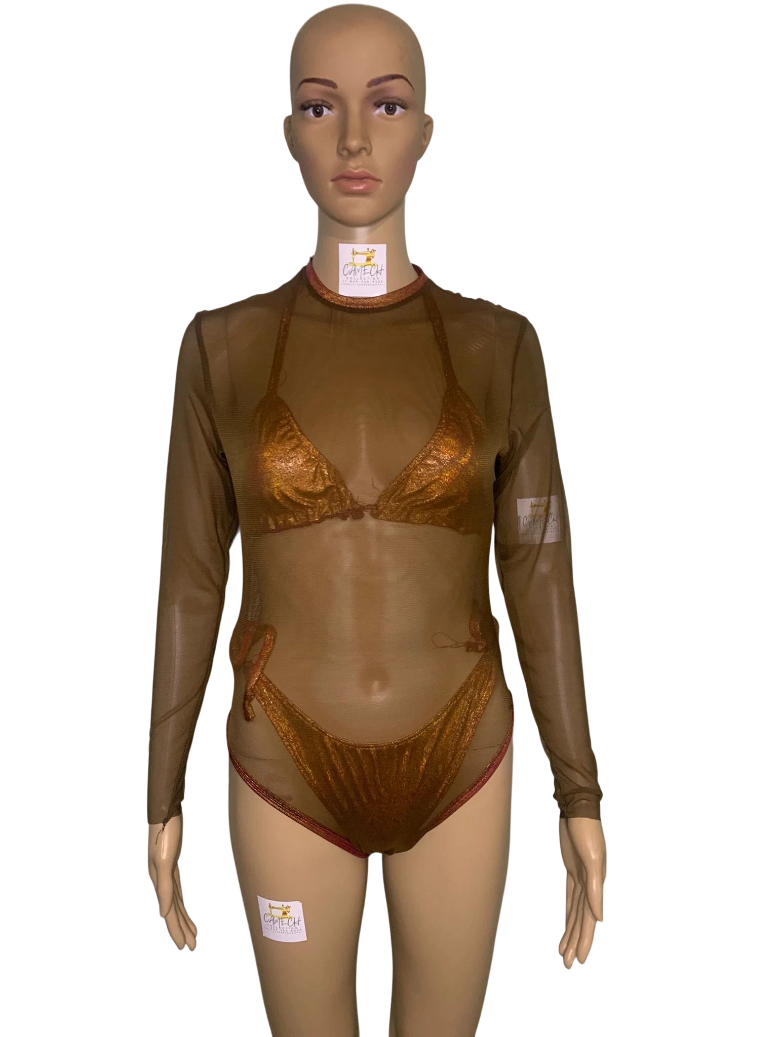 Brown mesh bodysuit with copper colored swimwear. Swimwear panty style: V-cut