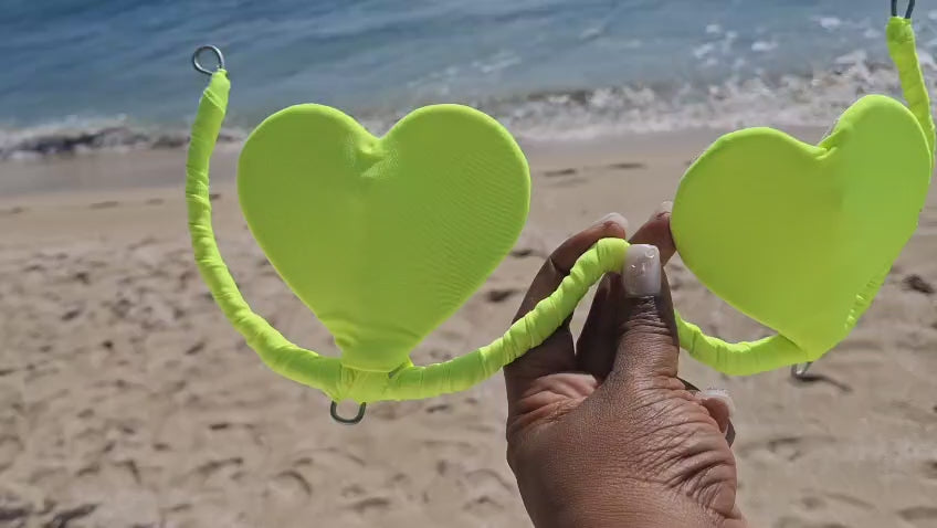 Shine bright and bold in this eye-catching lime green wire bra, crafted in a playful heart shape for the perfect mix of flirty and fierce. Hand-decorated with sparkling gems and metallic accents, it’s designed to catch every light — and every eye. Adjustable straps ensure comfort and support, while the soft inner lining keeps you glowing all day.