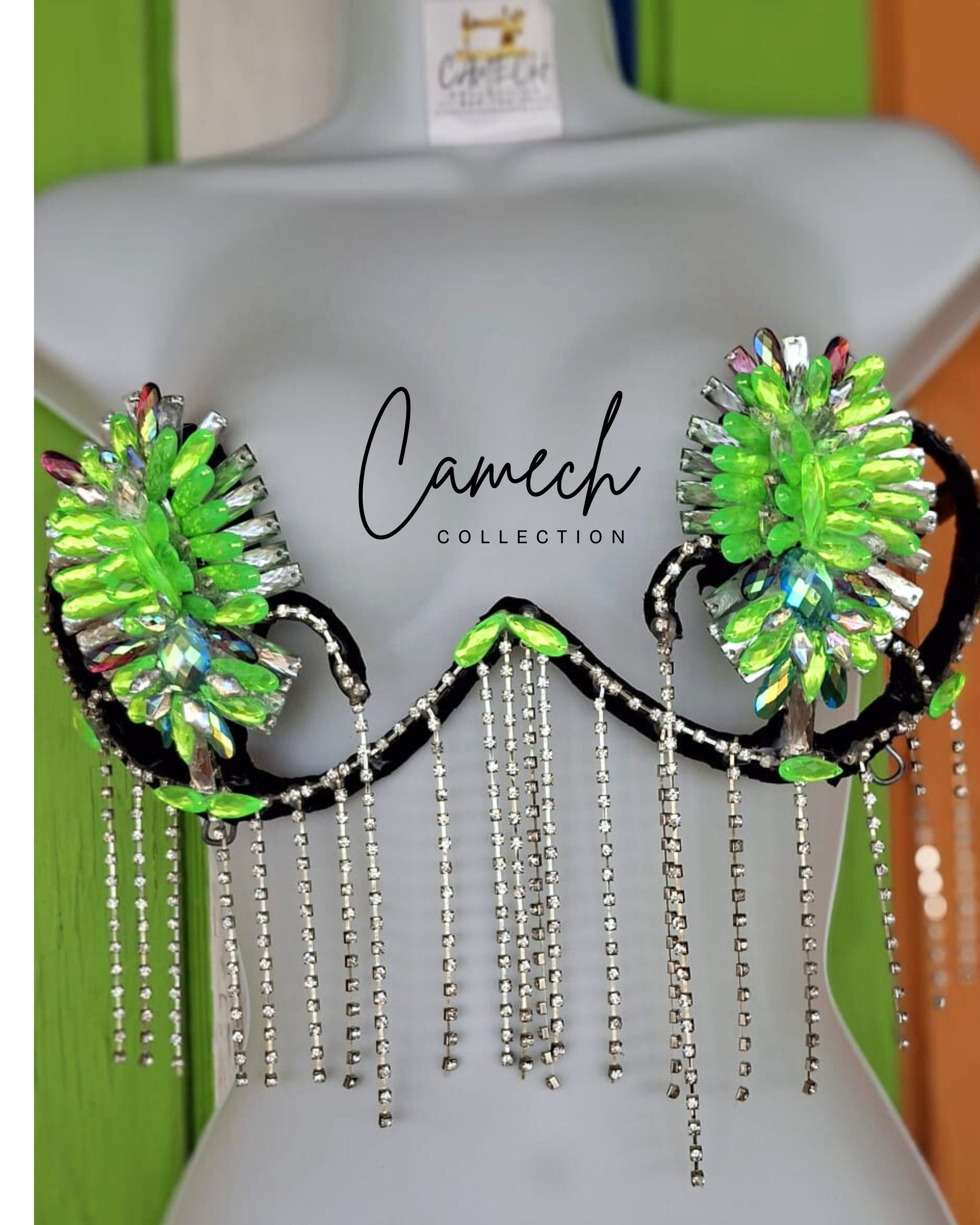 Stand out in vibrant style with our Jasper Wire Bra, crafted from lustrous neon-green fabric and adorned with matching rhinestones for a radiant glow. The structured wire design offers a flattering lift, while silver fringes add movement and shimmer with every step.
