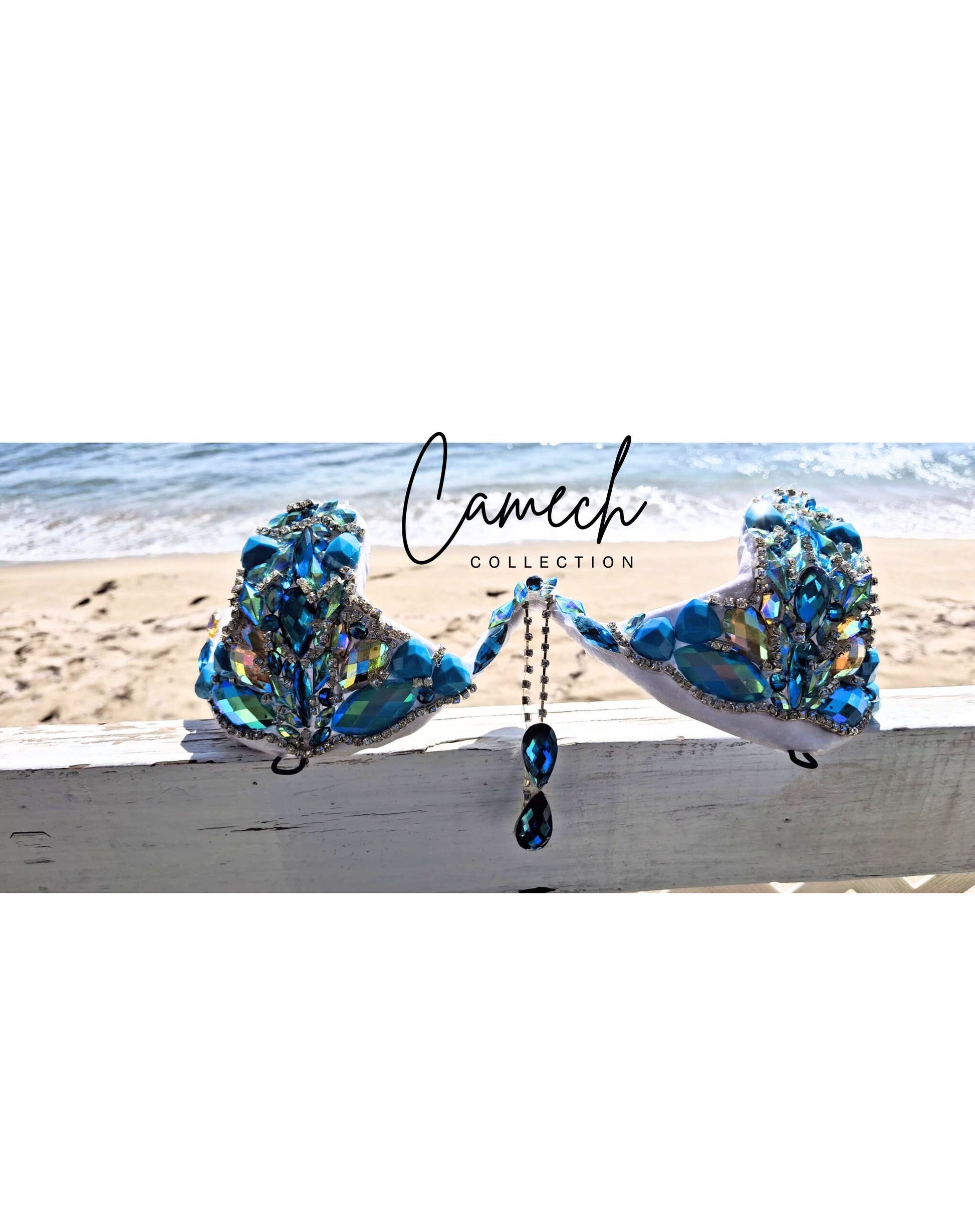 Dazzle in our Topaz Wire Bra, adorned with blue, teal, and turquoise rhinestones that catch every glimmer of light. Designed with a sculpted wire frame for support and finished with sparkling fringe details, this handcrafted piece brings bold island glamour to life. Perfect for carnival, fetes, or stage performances — made to shine as bright as you do.